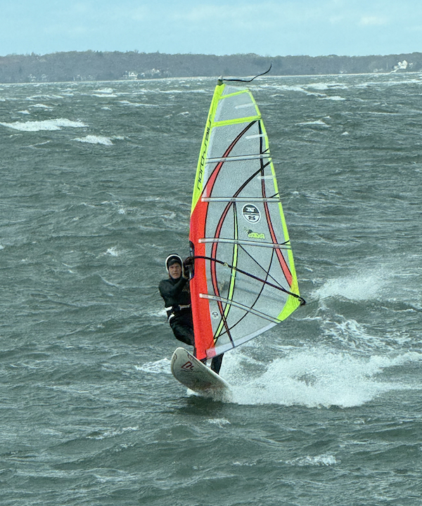 After much hemming hawing and avoiding I launched in the inlet. The wind was blasting, but the current was going into the inner bay so it was hard to get going. After two attempts to clear the inlet sailing westbound Jon Ford convinced me to shlep over to the beach side and launch from there.